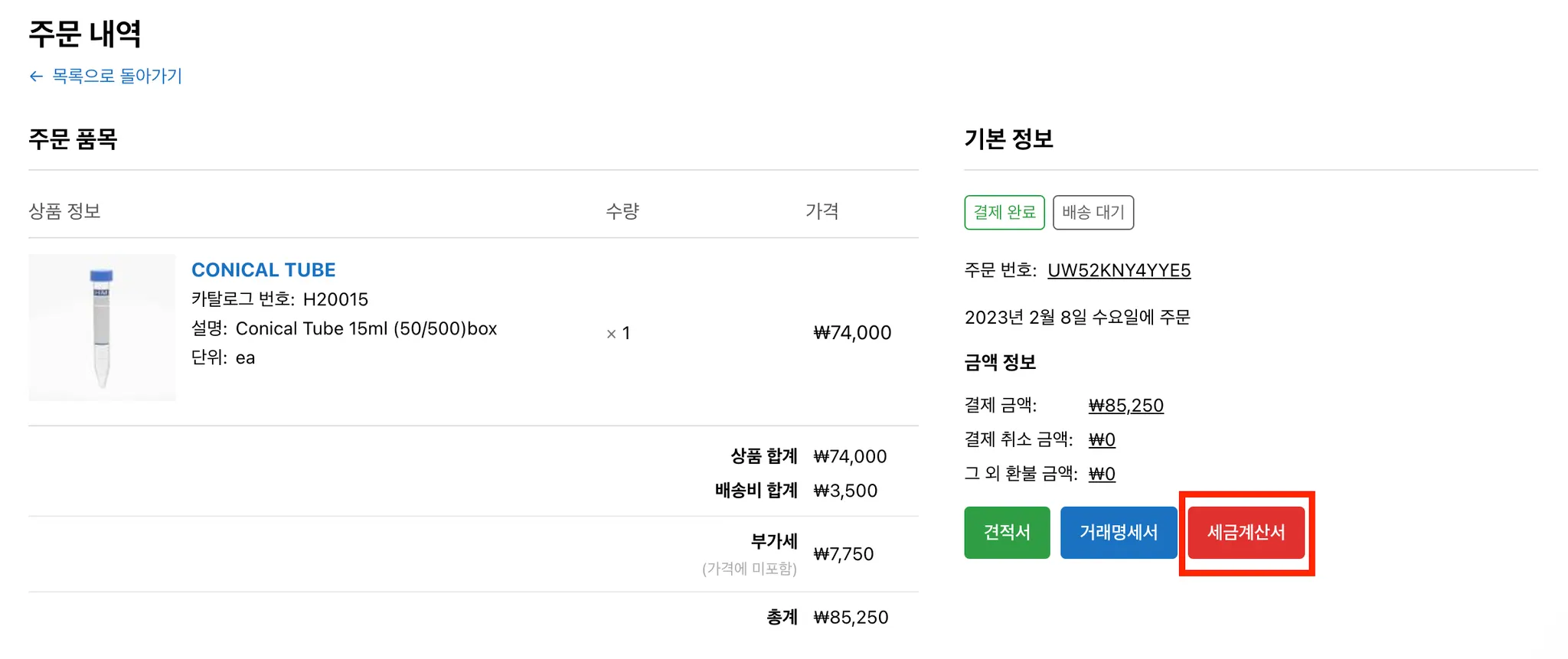 주문 상세페이지에서 세금계산서 버튼을 클릭시 세금계산서를 다운로드 받을 수 있습니다.
