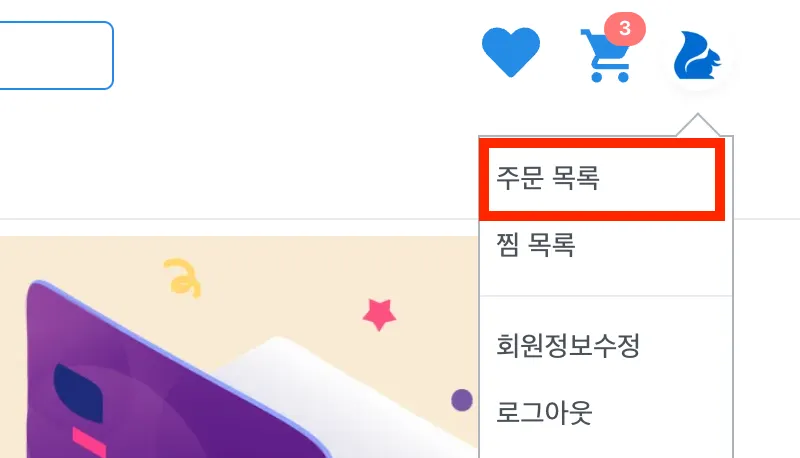 오른쪽 상단에 프로필을 클릭 후 주문 목록을 클릭합니다.