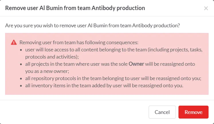 If someone permanently left and will not be using your Premium SciNote anymore, you might want to first remove them from the team(s) they were in to reassign their data onto you (you need to have the role of a Team Administrator to do this), and then lock their account to disable their access to SciNote (you need to have the role of Organization Administrator to do this).