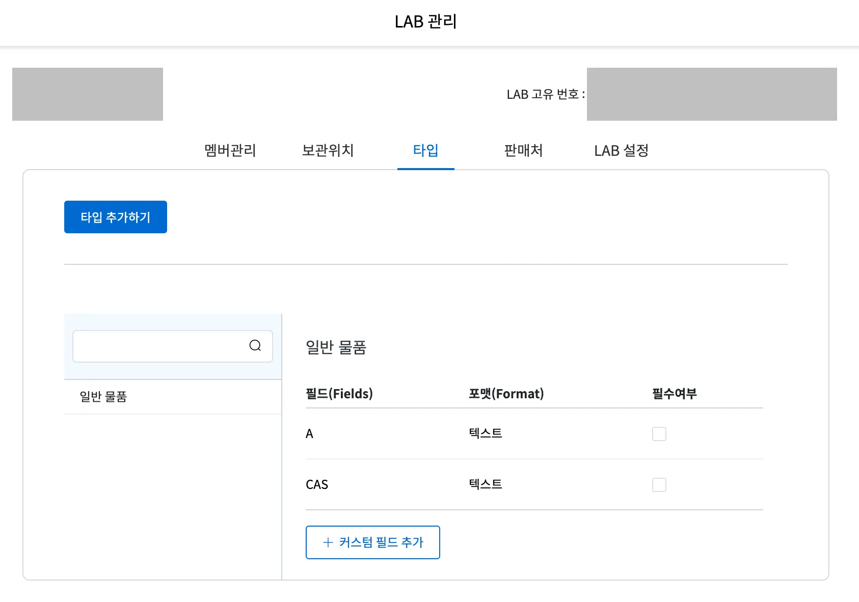 타입은 연구제품의 정보를 세부적으로 입력하기 위해 필요한 기능입니다. 텍스트, 숫자, 날짜의 값을 입력할 수 있으며 원하는 정보를 입력하기 위해 편집이 가능합니다.