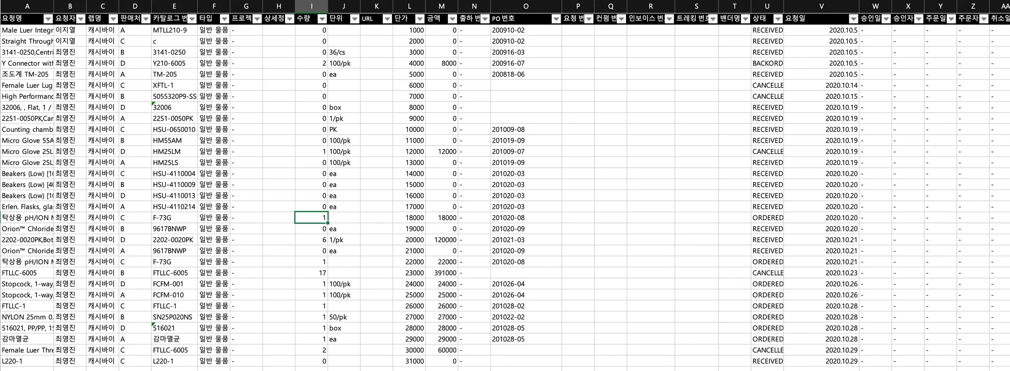 구매관리 ⇒ 내보내기를 통해 다운로드 받은 엑셀파일을 오픈합니다.
